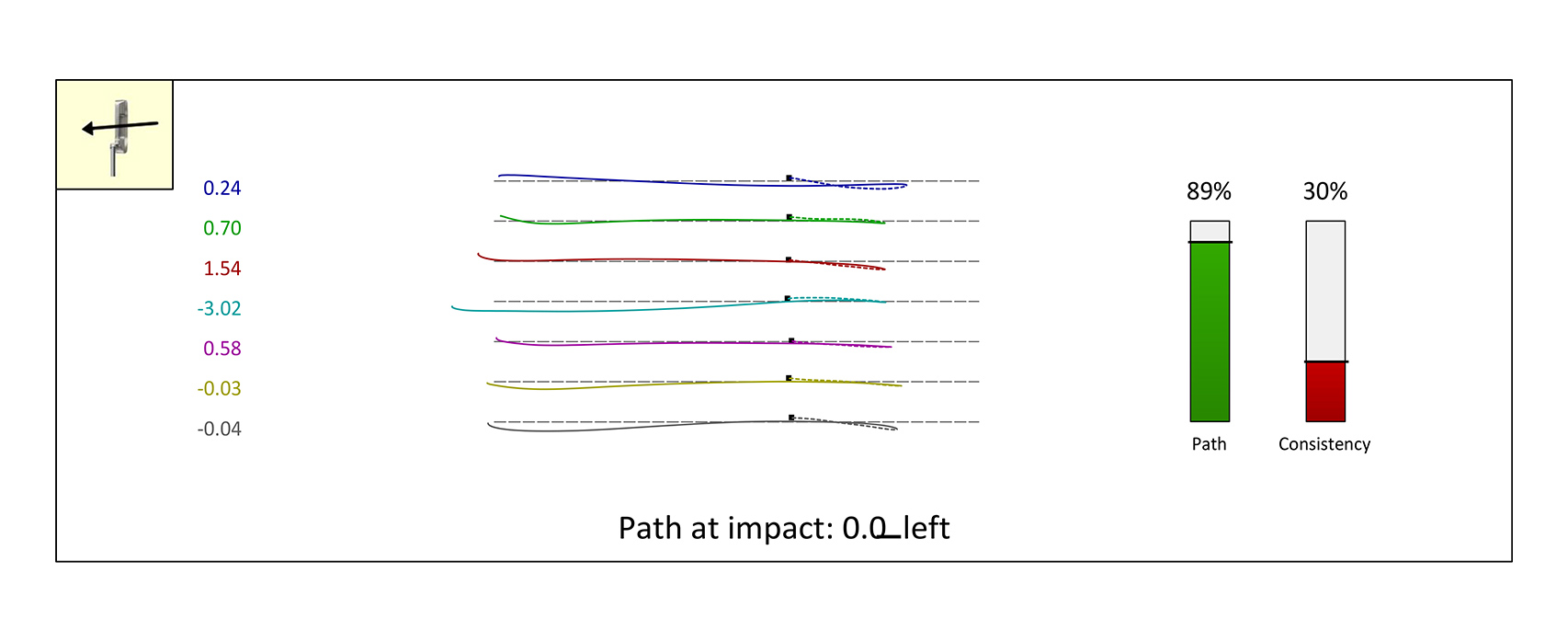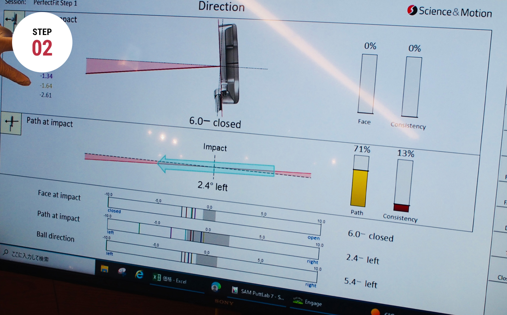 現在お使いのパターで実際にボールを打っていただきます。SAMがパッティング時に7つのデータを測定し、あなたのパッティング傾向を解析します。